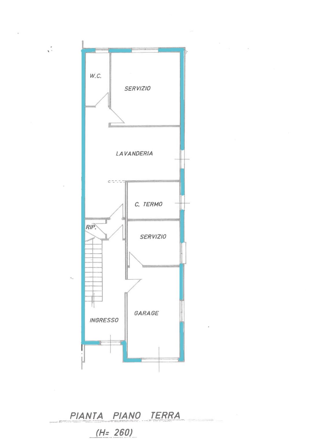 Piano terra con altezza interna di 2,60 troviamo l' ingresso e un'ampia zona servizi attualmente suddivisa in due spaziosi vani, oltre a bagno, centrale termica, lavanderia e garage.