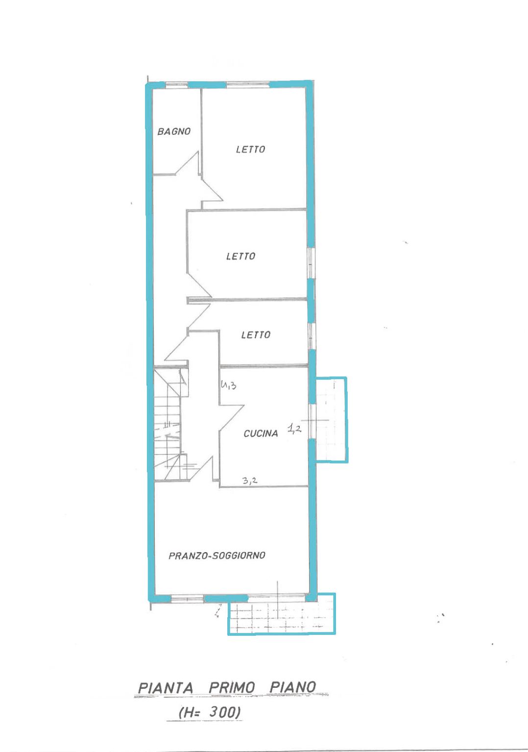 Il piano primo ospita la zona abitativa principale composta da cucina abitabile, soggiorno, tre camere da letto, bagno e due balconi.